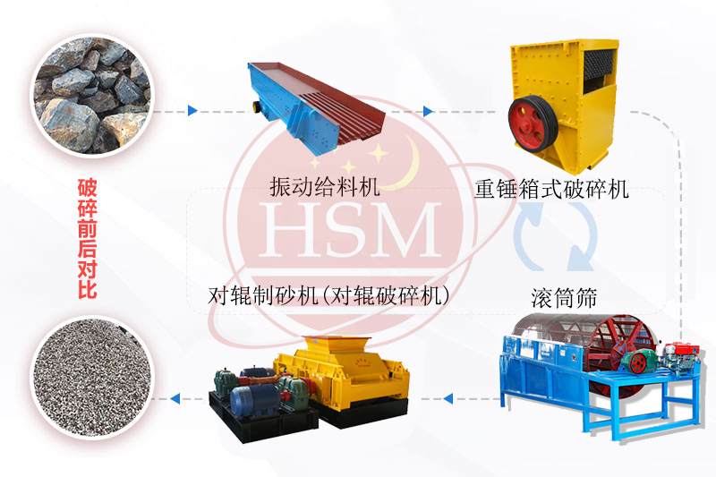 時(shí)產(chǎn)100噸對(duì)輥破碎機(jī)生產(chǎn)線制砂生產(chǎn)流程